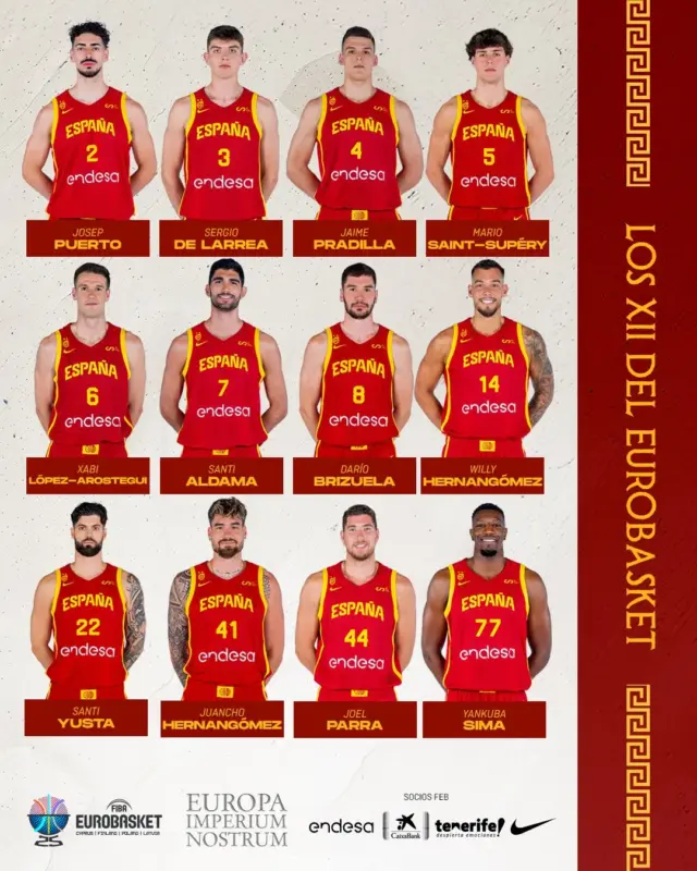 La base del equipo la forman los campeones del último EuroBasket, con los hermanos Willy y Juancho Hernangómez como líderes indiscutibles en la pintura. A ellos se unen jugadores esenciales en el esquema de Scariolo como Santi Aldama, el tirador Darío Brizuela y los polivalentes Xabi López-Arostegui y Jaime Pradilla, quienes fueron piezas clave en la conquista del último europeo. La renovación generacional se completa con la presencia de Josep Puerto, el pívot Yankuba Sima y otros jóvenes que han sabido ganarse un lugar, confirmando que el futuro del baloncesto español sigue asegurado.