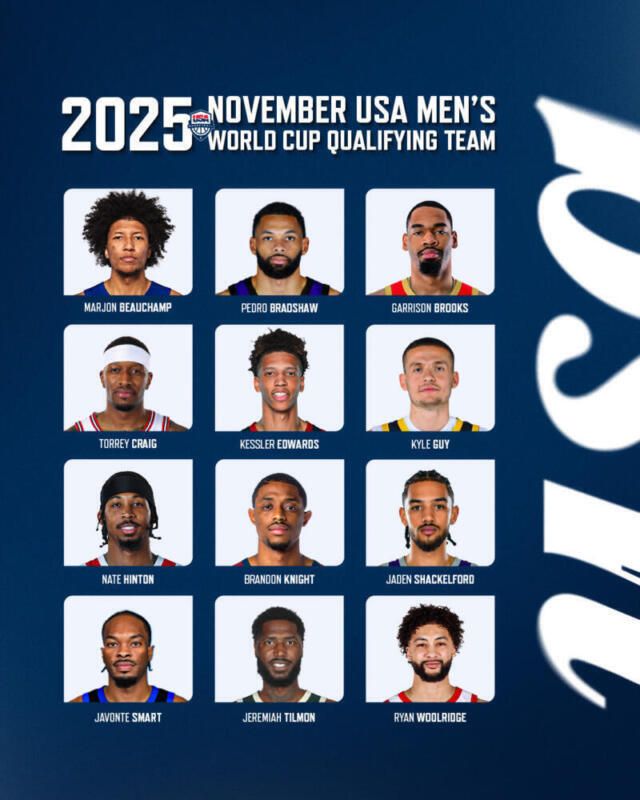 El 18 de noviembre de 2025, USA Basketball hizo oficial su lista de 12 jugadores que representarán al equipo nacional en dos partidos de clasificación para la Copa del Mundo contra Nicaragua. Estos encuentros se llevarán a cabo en Managua, Nicaragua, el 28 de noviembre y en College Park, Georgia, el 1 de diciembre. La selección está compuesta por un grupo variado de jugadores, la mayoría de ellos activos en la G League o como agentes libres.